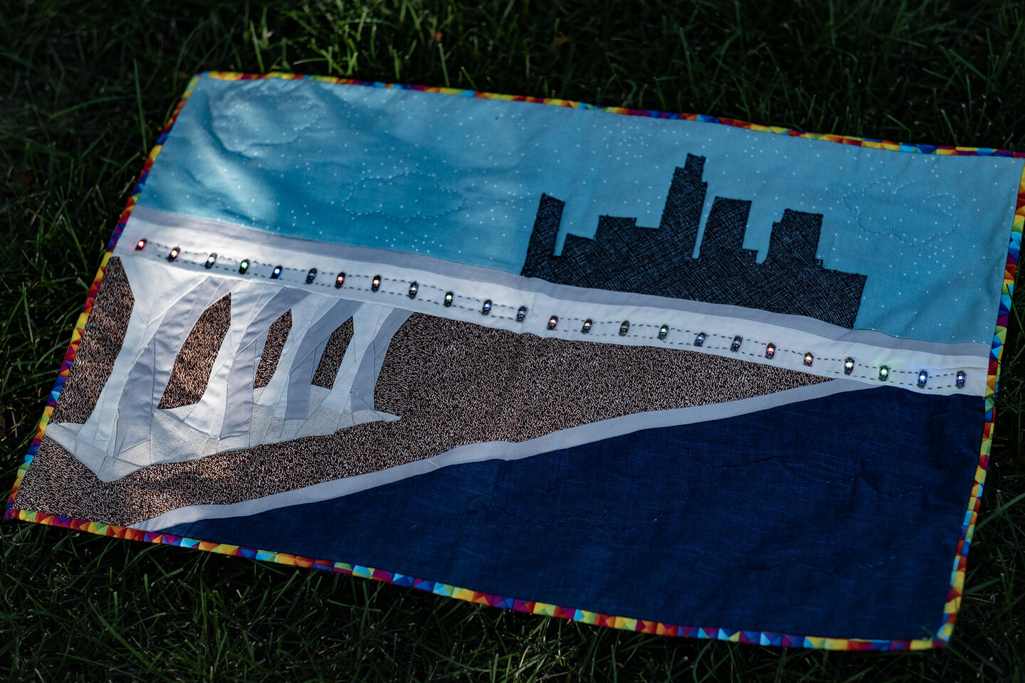 This quilt is inspired by the 35W Bridge in Minneapolis. During the month of June this bridge is light in rainbow colors in honor of Pride. The reason we celebrate Pride now in such a robust way in Minneapolis is because of Queer Trans women of color, Marsha P. Johnson and Slyvia Rivera. I have recreated this in quilt form with LED lights to light up the bridge and honor those who fought against racism before us.